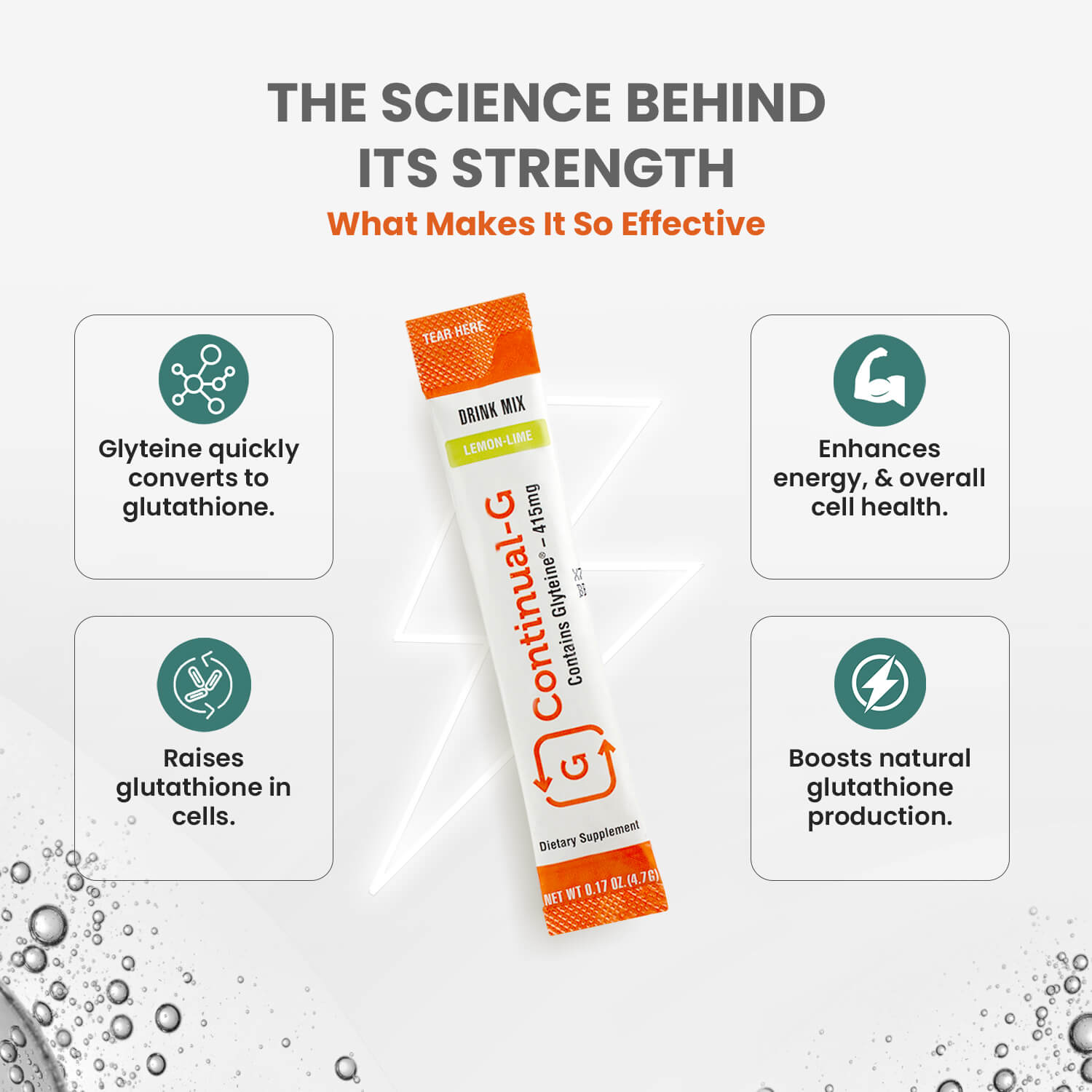 Clinical studies show that Glyteine®, the unique ingredient in Continual-G®, can significantly increase intracellular glutathione levels in under two hours. This rapid boost helps your cells immediately begin neutralizing excess free radicals and supporting overall cellular resilience.
