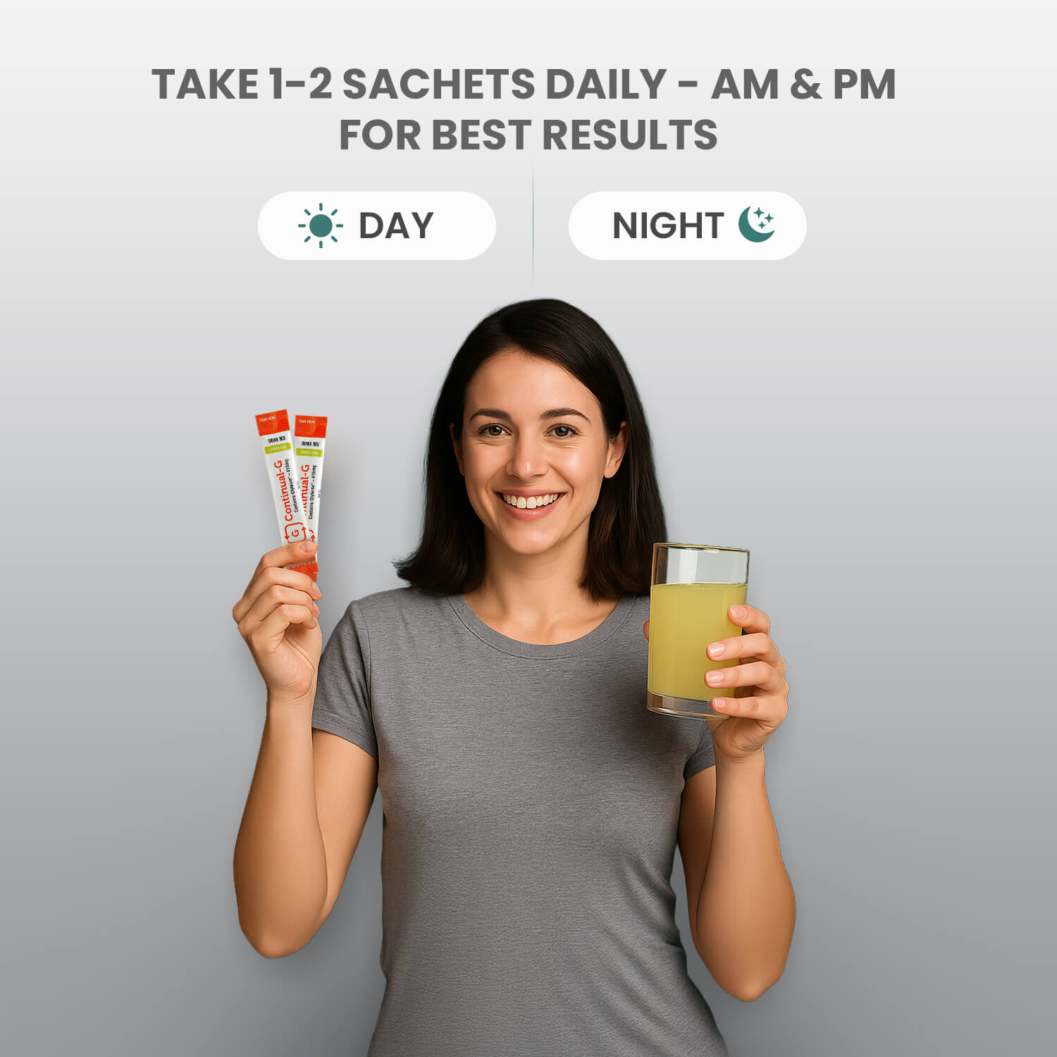 The recommended dosage of Continual-G® with Glyteine® inside is one drink sachet taken twice a day, or 2 capsules twice a day - ideally taken about 12 hours apart. The absorption of Glyteine® is not dependent on food consumption. Glyteine® is completely natural and safe, and no adverse effects have been reported during our clinical study.